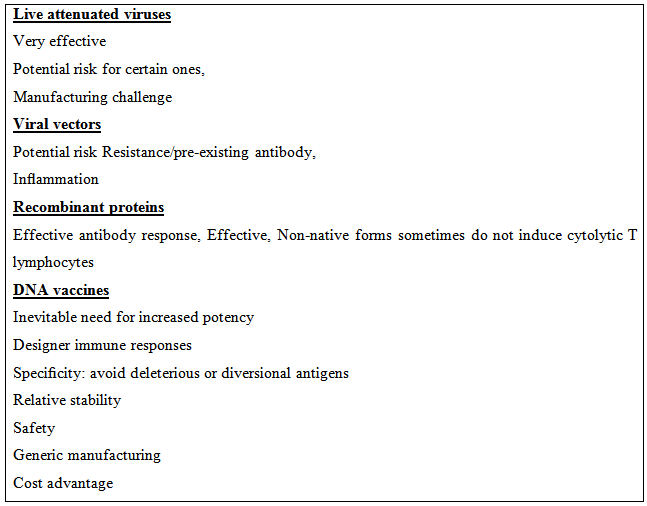 Despite the fact that viral vectors and DNA vaccines have parallel attributes as given in Table 1, they are only in their initial stages of clinical progress.Currently researchers worldwide are working on designing the vaccines in which the induction of CD8+ cytolytic T lymphocytes (CTL) responses and antibodies is emphasized due to the prominent role of CTL in such vaccines. Similarly designing of vaccines that can induce specific types of T helper responses, Th1 or Th2 are encouraged for the same reasons.