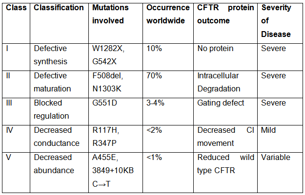 The mutation in CFTR gene has been classified into five classes: