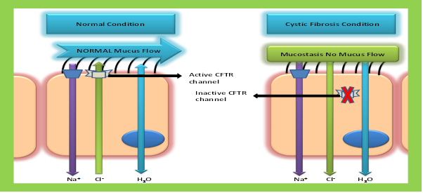 As a result of mutation in the long arm of chromosome number 7 the CTFR protein can no longer function properly leading to deranged or unbalanced transport of chloride, sodium and bicarbonate ions. This unbalanced transport of CFTR-affected ions leads to increased sodium and chloride content in sweat and increased resorption of sodium and water from the respiratory epithelium causing mucostasis characterized by relative dehydration of the airway epithelium and alteration in the tenacity and viscosity of mucous and ciliary dysfunction.