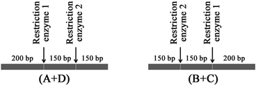 Digestion with both restriction enzymes-1 and 2 gives two bands of sizes 200 bp and 150 bp. The possible restriction maps from the given data are: (A+D) and (B+C) i.e.