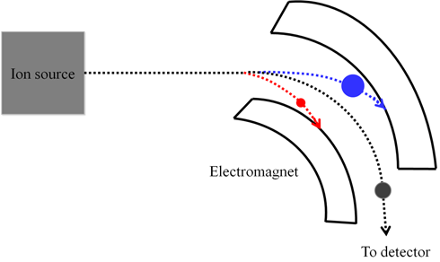 possible to sequentially allow all the ionic species to reach the detector by gradually varying the magnetic field. Assume that the magnetic field strength is zero initially. All the ions will move straight (Equation 11.8) and collide with the curved MS tube losing their charge. If the magnetic field is slowly increased from zero to the maximum value, the ions with lowest momentum and highest charge will appear first while the ions with highest momentum and lowest charge will appear last.