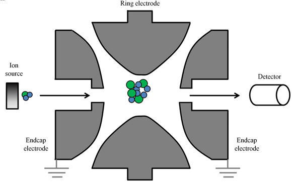 All the three electrodes have hyperbolic surfaces. Unlike linear quadrupole (quadrupole with four parallel rods) wherein electrostatic forces act in two axes, forces act in all the three axes in an ion trap. This implies that the stable trajectories of the ions cause them to be trapped. Ion traps provide higher sensitivity and are useful in tandem mass spectrometry; ions of desired mass can selectively be allowed to escape the trap by varying the ac potential; the escaped ions can then be analyzed by another mass analyzer attached in tandem.