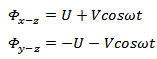 Consider the rods in x-z plane to be at a positive potential, U and the rods in y-z plane to be at a negative potential –U. An a.c. potential is subsequently applied to the rods such that the a.c. potential on the rods in x-z plane is 180° out of phase than that applied on the rods in the y-z plane. The potential on the rods in x-z and y-z plane can therefore be represented as