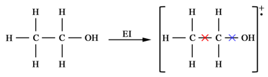 The cross signs in the molecular radical cation represent the cleavage sites of the molecular ion. Cleavage between methyl and methylene carbons (red cross) can result in [CH3]+ or [CH2OH]+ ions while cleavage between methylene carbon and oxygen can result in [C2H5]+ or [OH]+ ions. The electron ionization mass spectrum for ethanol will therefore look like as shown in Figure 13.2. The idea behind identifying the structure of the molecules is to look at the differences between the peaks. A difference of 15 Da will be due to methyl loss, a difference of 17 is suggestive of the hydroxyl group, a difference of 29 can be due to the loss of an ethyl or aldehyde group. This information can be used to identify the molecules. In fact, there are softwares available which can provide the possible molecular formulae of the compound when fed with the MS peaks.
