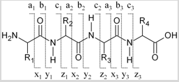 Box 13.1: Peptide fragmentation Fragmentation of peptides in a collision cell occurs in a well-defined manner; the fragmentation largely occurs along the peptide backbone with some side-chain fragmentation. The cleavage along the peptide backbone can occur at NH–Cα, Cα–CO, and CO–NH bonds. Each cleavage produces two species, one of which is charged and the other one neutral. As the charge can lie on any of the species produced, six different types of ions are generated. The nomenclature of these ions is shown in the figure below:
