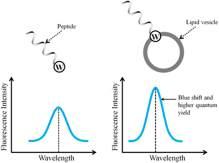Peptide-lipid interactions: Interaction of the peptides having Trp residues with lipid bilayers can easily be studied using fluorescence spectroscopy. Interaction of the peptide with lipids brings the tryptophan in relatively hydrophobic environment causing a blue shift in emission spectrum (Figure 7.1).