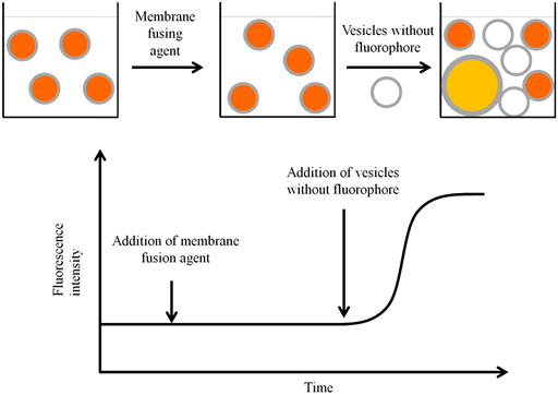 iiii. Fusion of lipid vesicles can also be studied using the same approach. Vesicles that contain self-quenching concentrations of the fluorescent dye are titrated with the vesicles without fluorophores. A fusion will result in the dilution of fluorophores; the consequent decrease in self-quenching is exhibited as an increase in the fluorescence intensity (Figure 7.4).