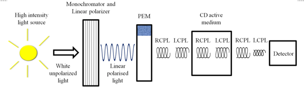 | As CD is simply the difference in the absorbance of the LCPL and RCPL lights, a CD spectrometer, also known as a CD spectropolarimeter, is basically an absorption spectrophotometer (Figure 8.7). The instrument has a light source, usually a Xenon lamp. The polychromatic light from the source is converted to monochromatic radiation which is further converted to linearly polarized light by a polarizer. The linearly polarized light passes through a photoelastic modulator that alternately converts the linearly polarized | ![]() |