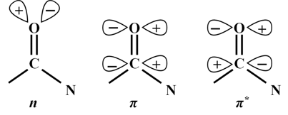 Figure 9.1 The peptide bond showing molecular orbitals involved in electronic transitions |