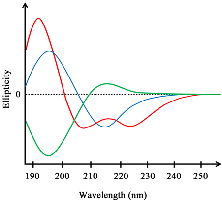 Figure 9.2 Far UV circular dichroism spectra of α-helix (red), β-sheet (blue), and unordered conformation (green) |