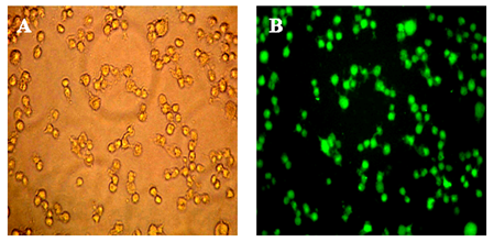 Figure 15.3 Bright-field (A) and epifluorescence (B) images of Cos-7 cells expressing GFP.