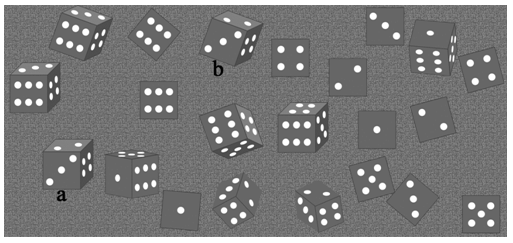 Figure 20.4 Images of the identical dice in different orientations. Image ‘a' can be aligned with image ‘b' by rotating it 20° (clockwise) and translating it to the coordinates of image ‘b'. Stacking of a large number of such images is used to enhance contrast in cryo-EM.