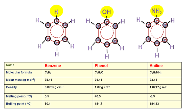 Figure 28.1: Chemical Structure and physical Properties of benzene, phenol and aniline.