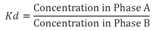 Principle of Seperation: How a physical or chemical property will allow to isolate a particular substance? The mixture of compound 1 and 3 is shown in Figure 28.2 and assume if we are using boiling point as a criteria to isolate them. As we will heat the mixture there will two phase forms, one liquid phase and other is vapor phase. The molecules of compound 1 and 3 will distribute between these two phases and as the temp is near to boiling point of compound 1, more amount of 1 will be present in vapor phase than liquid phase. Where as more number of compound 3 will be in liquid phase. Eventually as this process will continue, at the end two molecules will get separated from each other. The distribution coefficient (Kd) to describe the distribution of compound 1 between two phase A and B is as follows: