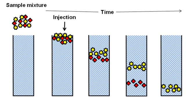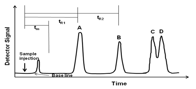 Chromatogram: The plot of elution volume along with the absorbance is known as chromatogram as given in Figure 28.4. The volume or time it takes for a analyte to come out from the column is known as retention volume or time. The chromatogram may have separate peaks (A and B) or peaks (C and D) with overlapping base, these peaks are called fused peaks.