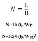 When Rs=1, the separation of two peaks is 97.7% and a column with Rs more than 1.5 considered good. The number of distribution events govern the ability of a column to separate the two analytes. In another words, resolution is directly proportional to the number of distribution events. In column chromatography, each thin plain of column matrix participate in distribution of molecule. Assume height of a distribution plain is H and length of a column is L, hence number (N) of distribution plain in a column is given by,