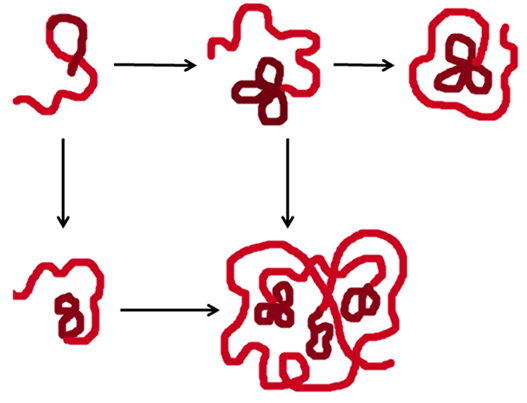 Figure 31.1: Folding of Protein in an aqueous environment. Following a series of folding stages, protein adopts a 3-D conformation with hydrophobic patches present in the core.