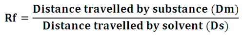 If the distance travelled by a molecule on TLC plate is Dm where as the distance travelled by the solvent is Ds, then the retardation factor (Rf) of molecule is given by: