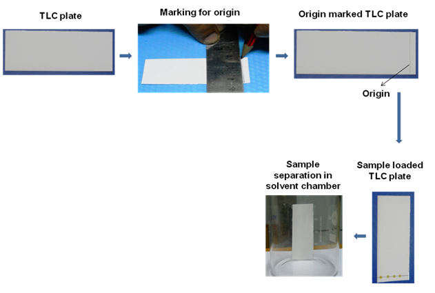 Running of the TLC: Once the spot is dried, it is placed in the TLC chamber in such a way that spot should not be below the solvent level. Solvent front is allowed to move until the end of the plate.