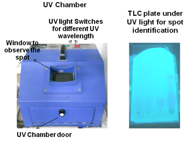 2. Fluorescence- Several heterocyclic compounds give fluorescence in UV due to presence of conjugate double bond system. TLC plate can be visualized in an UV-chamber (Figure 37.4) to identify the spots on TLC plate.