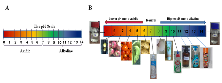 Figure 2.2: pH Scale and pH of different fluids. (A) pH Stripe, (B) pH in different biological fluids and daily use items. |