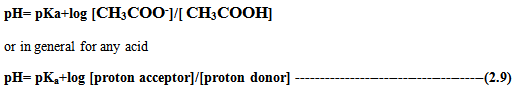 The equation 2.9 is known as Henderson-Hasselbalch equation and it relates molar ratio of proton donor/acceptor with pKa at a given pH. It is also used to calculate the amount of proton donor, acceptor needed to prepare the solution of given pH, if pKa is given.
