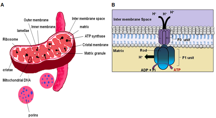 Figure 4.1: Mitochondria. (A) Struture of mitochondria and (B) enlarged view of ATP Synthase.
