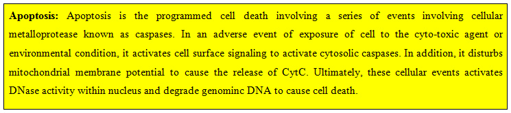 Cristae occupies major area of membrane surface and house machinery for anaerobic oxdidation and electron transport chain to produce ATP. Due to presence of inner and outer membrane, mitochondria can be divided into 2 compartments: first in between the inner and outer membrane, known as intermembrane space and second inside the inner membrane known as matrix . The proteins present in intermembrane space have a role in executing “ programmed cell death ” or “ apoptosis ”. Matrix is the liquid part present in the inner most compartment of the mitochondria and it contains ribosome, DNA, RNA, enzymes to run Kreb's cycle and other proteins. Mitochondrial DNA is circular and it has full machinery to synthesize its own RNA (mRNA, rRNA and t-RNA) and proteins. Marked differences exist between mitochondrial DNA and DNA present in nucleus and these differences are not discussed here due to space constrain. Electron transport chain components (complex I to complex V) are integral proteins, present in the inner membrane of mitochondria. During metabolic reactions such as glycolysis, Kreb's cycle [metabolic reaction are discussed later] produces large amount of reducing equivalent in the form of NADH2 and FADH2. Electron transport chain process reducing equivalent and flow of the electron through different complexes (Complex I to Complex IV) causes generation of proton gradient across the membrane. Proton expelled in the intermembrane space returned back to the matrix through complex V (ATP synthase) to generates ATP. ATP synthase (Figure 4.1, B) is a mushroom shaped multimeric protein complex, mainly composed of two proteins Fo and F1. Fo is a membrane bound portion where as F1 is the complex present into the lumen towards matrix. FoF1 complex of mitochondria harvest the proton motive force to catalyze phosphorylation reaction involving ADP and phosphate to generate ATP.