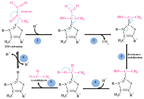 - Release of acetaldehyde and regeneration of TPP from hydroxyl-TPP for next round of enzymatic catalysis.