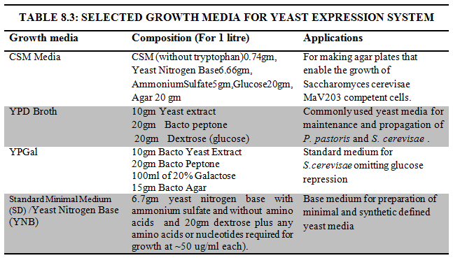 Yeast expression system offers advantages of speedy growth, easy genetic manipulation, low cost media with the characteristics of higher eukaryotic systems such as post translational modifications and secretory expression. Yeast expression system mainly utilizes Saccharomyces cerevisiae (S. cerevisiae ) and Pichia pastoris ( P. pastoris ) strains for cloning and protein overexpression. For the growth, propagation and protein overexpression of these strains specific formulations and ingredients are required (Table 8.3). The common type of yeast expression media are given in Table 8.3.
