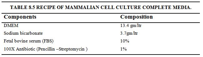 To explain the method of media preparation, we are taking the example of DMEM media (Figure 8.2). Measure 80 - 90% of the final volume of cell culture grade water. Add 13.4 gm dry powder medium to the water and mix to dissolve it completely. For each liter of DMEM, add 3.7g/L of sodium bicarbonate, mix completely and adjust the pH to 6.9 -7.1 using 1N NaOH or 1N HCl. Finally add cell culture grade water to the media to bring it to the final volume. Sterilize the solution using a sterilized membrane filter with a pore size of 0.22μm. Supplements, such as antibiotics and serum can be added to the sterilized solution using aseptic technique.