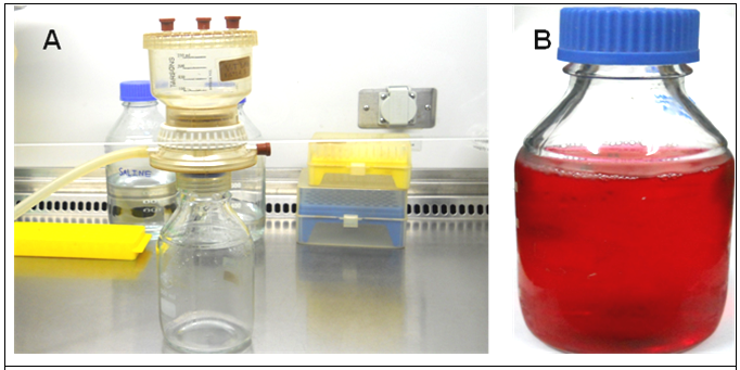 Figure 8.2: Sterilization of cell culture medium (a) filteration unit set up for the filteration of DMEM media through 0.22μm filter. (b) complete media containing 10% serum and 1% pencillin–streptomycin antibiotic.