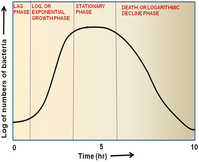 4. Death Phase- When substrate is not sufficient from dying cells, death rate of bacteria superseed rate of growth and as a result number of bacteria declines sharply.