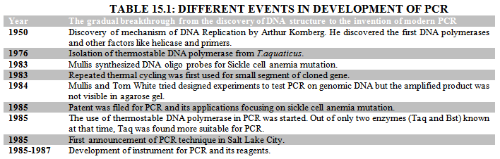 Introduction : Polymerase chain reaction (PCR) is used to amplify a DNA sequence to produce millions of copies. Kary Mullis discovered the PCR and got Nobel Prize in Chemistry in 1993 for his discovery. Since then, PCR has been used in various applications in medicine, animal science, plant science, food science etc. The different events to develop present day PCR is given in Table 15.1.