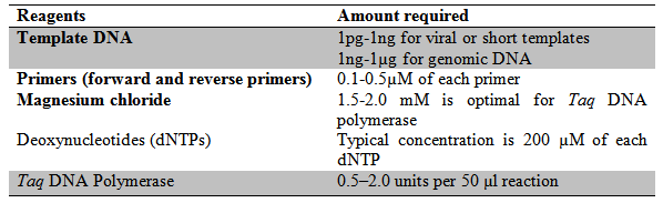 Reagents: The reagents required for a complete PCR reaction volume is given in the table