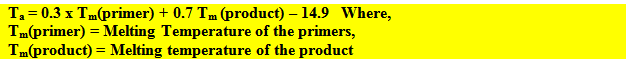 3. Primer annealing temperature (Ta): Too high Ta will produce insufficient primer-template hybridization resulting in low PCR product yield while too low Ta will lead to non-specific PCR products caused by a high number of base pair mismatches. Since Ta is the function of Tm so can be calculated with respect to melting temperature as given below: