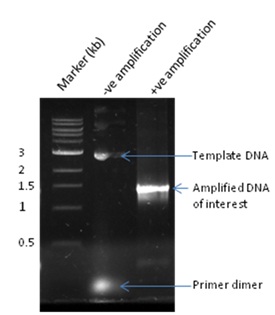 Analysis of PCR results: Once PCR cycle is complete, the amplified product is loaded in the agarose gel and observed after ethidium bromide staining under UV light source (Figure 15.3). A water blank reaction is included to monitor the cross contaminating DNA source as template. The percentage of agarose gel depends on the size of DNA to be visualized. Generally 0.8-1% agarose gel is used for analyzing 0.5-5 kb amplified DNA while a DNA of larger size or genomic DNA is visualized in gel as low as 0.5%.