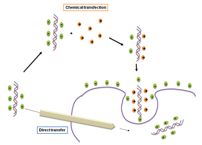 1. Chemical transfection techniques- The principle behind the chemical transfection technique is to coat or complex the DNA with a polymeric compound to a reasonable size precipitate (Figure 21.1). It facilitates the interaction of the precipitate with the plasma membrane and uptake through endocytosis. There are multiple chemical compounds have been discovered which can be able to make complex and deliver DNA into the mammalian cell.