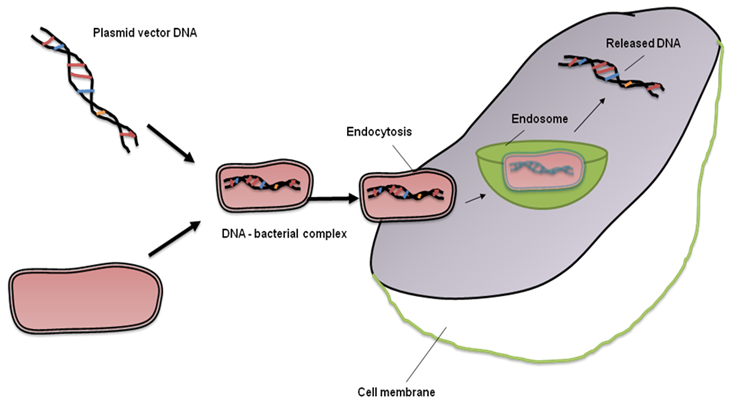 Figure 21.4: Proposed mechanism of transfection of mammalian cell with bacteria.