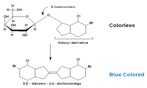 Figure 22.2: Chemical conversion of X-gal during blue-white screening.