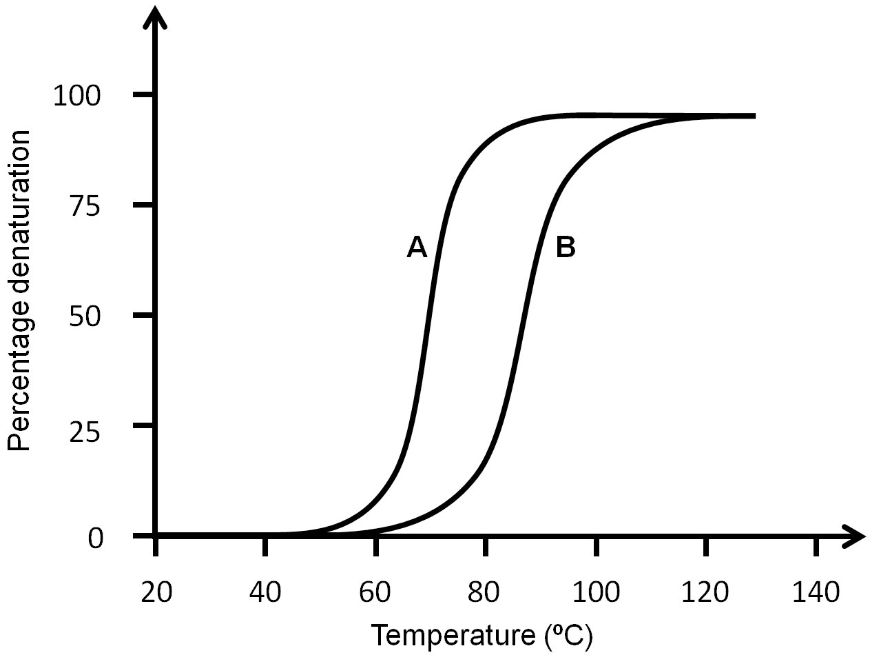 Q 2: You are given two DNA molecules, A and B having equal lengths. Thermal denaturation curves of the two DNAs are different from each other as shown below: