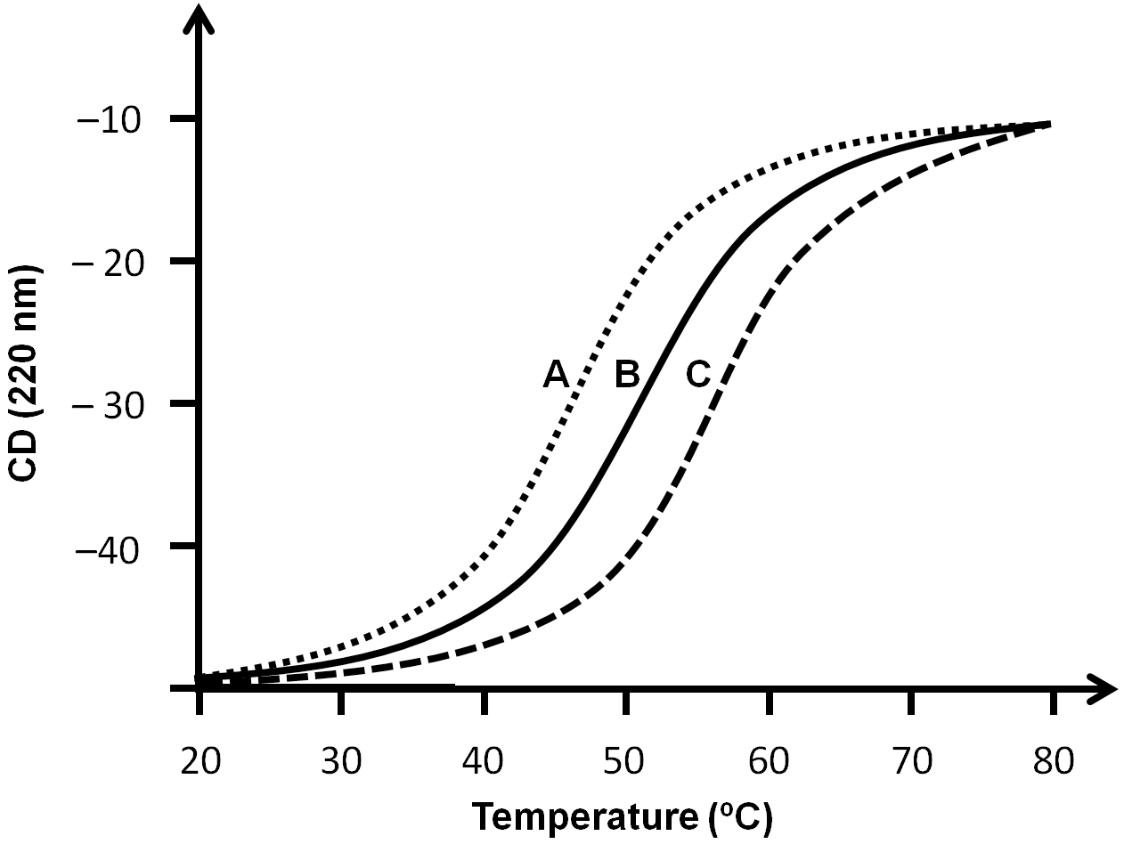 Q 3: The figure below shows the thermal denaturation of the three related proteins A, B, and C using circular dichroism spectroscopy: