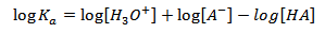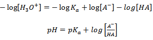 where, p is a shorthand for negative logarithm (–log). The equation 3.8 is also known as the Henderson-Hasselbalch equation. From Henderson-Hasselbalch equation, pKa can be defined as the pH at which an acid is 50% ionized.