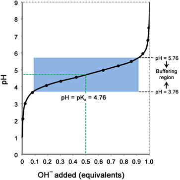 Titration of a weak acid (acetic acid) with a strong base (NaOH) is shown in figure 3.1. Addition of NaOH neutralizes the H+ ions present in the solution; thereby increasing its pH. Consumption of H+ ions drives the dissociation of the CH3COOH into CH3COO− and H+ (Le Chatlier's principle). As more and more of NaOH is added, the pH of the solution increases. This increase in pH is small when the solution reaches the pH close to the pKa of acetic acid. A weak acid, therefore, provides a resistance to change in pH near its pKa value. This resistance to change in pH by an acid near its pKa is the concept of a buffer.