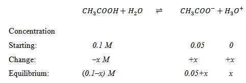 Therefore, the equilibrium concentrations of CH3COOH, CH3COO−, and H3O+ are 98.7 mM , 1.3 mM , and 1.3 mM , respectively.