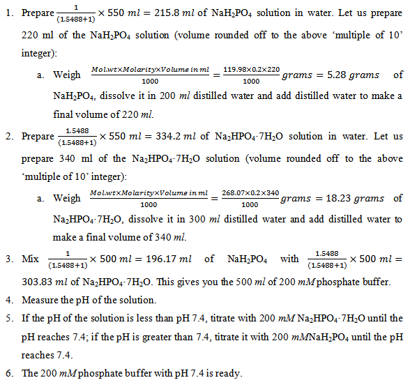 We know that Na2HPO4-7H2O and NaH2PO4 are required in 1.5488: 1 molar ratio. We can prepare the 200 mM solutions of both Na2HPO4-7H2O and NaH2PO4 in a 1.5488:1 volume ratio. As we need to prepare 500 ml buffer, we would perform the calculation for a slightly higher volume, say 550 ml .