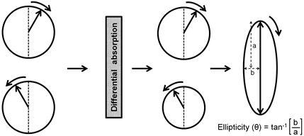 Differential absorption of the two circularly polarized lights results in elliptically polarized light and CD is historically represented in terms of ellipticity (θ) which is the angle whose tangent is the ratio of the minor to major axis of the ellipse (Figure 9.3).