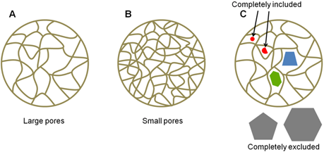 Figure 23.1 The diagrammatic representation of the beads with different porosities. Molecules completely included (shown in red) and completely excluded (shown in grey) are also shown in panel C. |