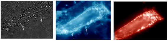 Figure 33.2 : Phagosome-lysosome interaction by fluorescence microscope. Arrow indicates the position of phagosome fused with lysosome.