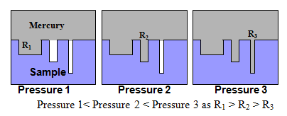 The pressure required for filling up the pores as a function of pore size is schematically shown in Fig.5. As pore radius decreases in the order r1> r2> r3, requried pressure for filling the pores increases in order of Pressure 1< Pressure 2 < Pressure 3. The available instruments can measure pore size up to 2 nm using a maximum operating pressure of about 400 MPa.